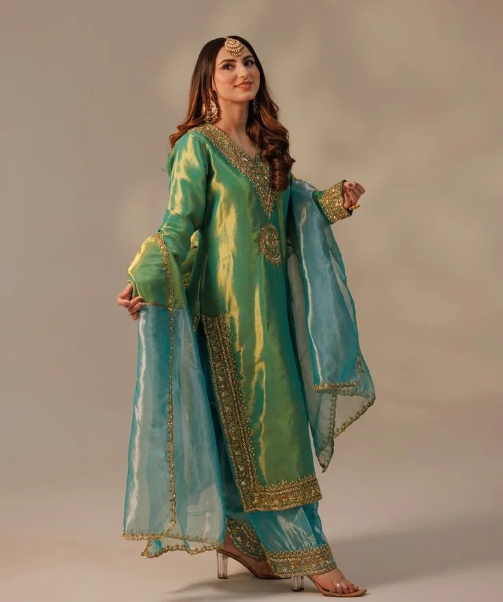 Emerald Gota Patti Silk Suit: Iridescent Green and Teal Celebration Wear