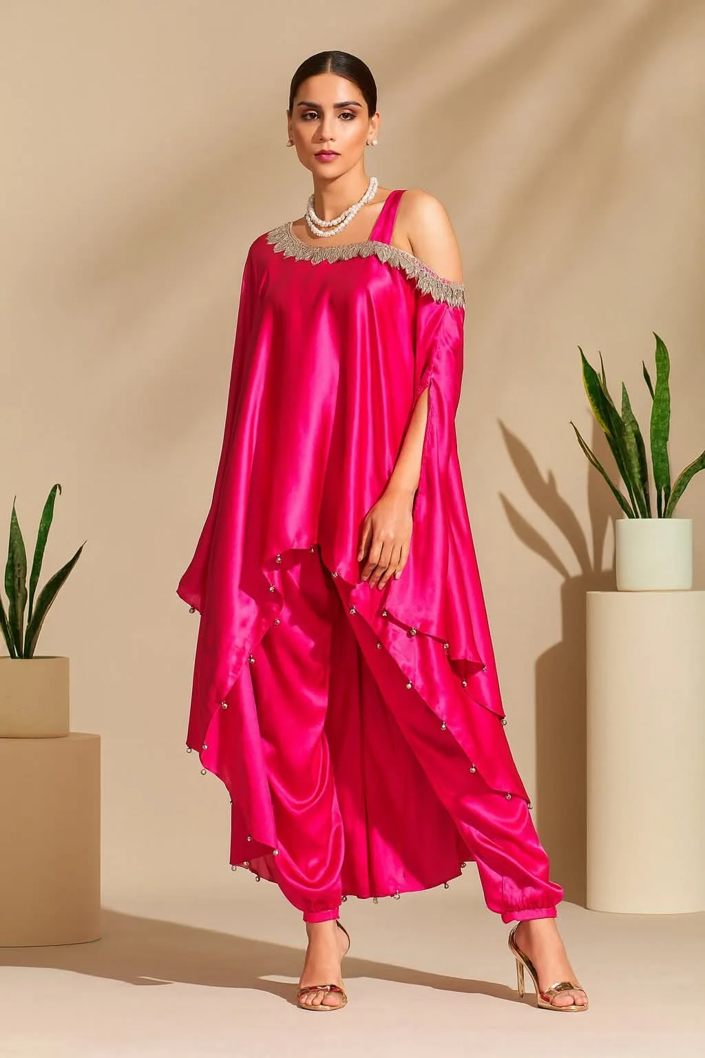 Rani Pink Cold-Shoulder Dhoti Suit: Modern Satin Drape Ensemble