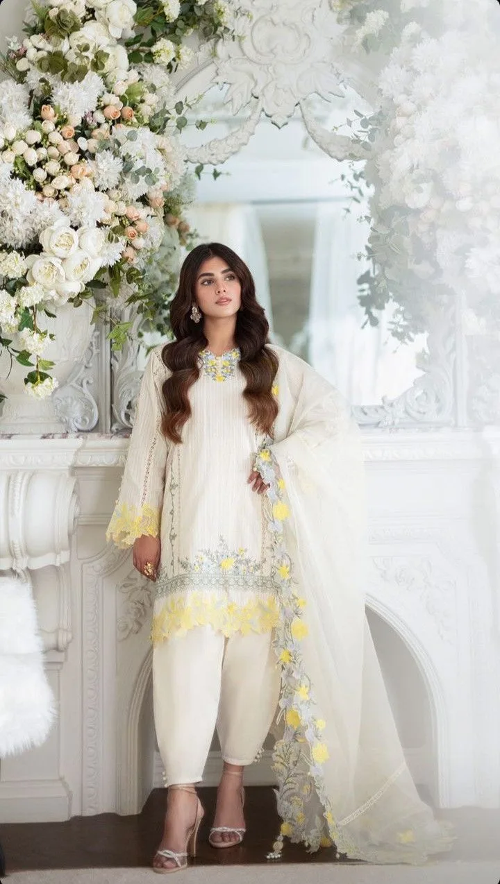 - Dupatta: Paired with a delicate sheer white dupatta that features matching floral embroidery cascading down the border.