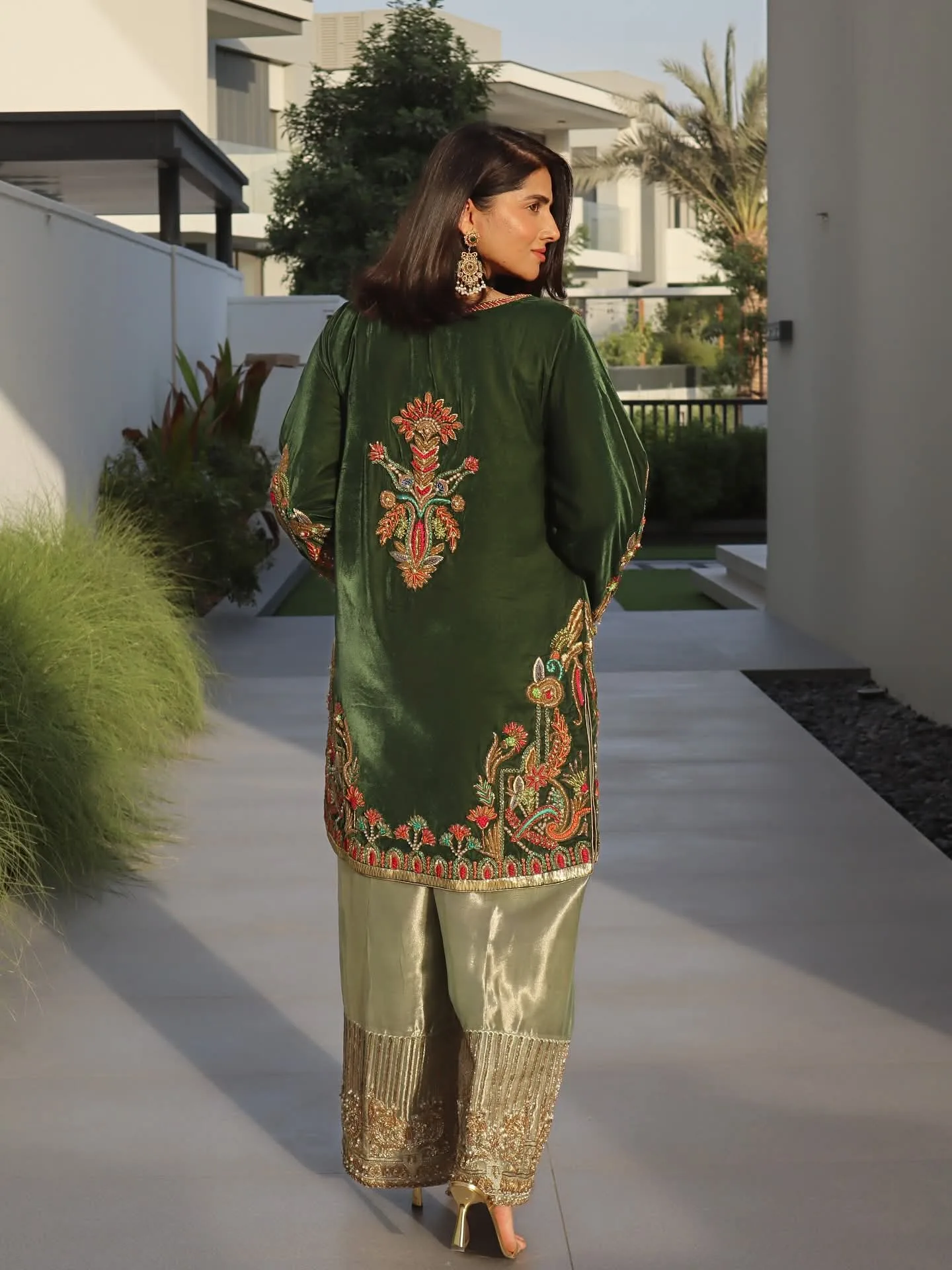 Drape yourself in unparalleled luxury with the Emerald Zari Velvet Tunic Set. This exquisite ensemble is a masterpiece of craftsmanship, blending the richness of velvet with dense, vibrant traditional handwork.
