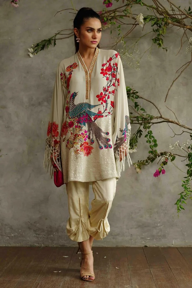 The light, airy silk tunic in a sophisticated Almond Beige (or Ivory) provides the perfect canvas for the main feature: the vibrant, hand-painted Peacock motif. Watch the plumage come to life with brilliant teals, magentas, and corals, complemented by delicate floral branches.