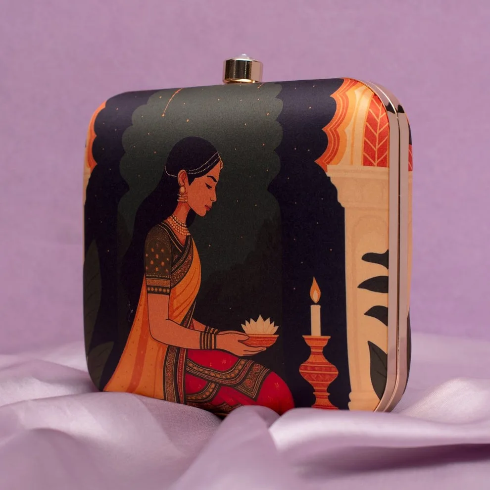Chic, compact, and crafted to perfection — this clutch is your ideal companion for kitty parties and special gatherings. Its sleek design ensures it matches effortlessly with your favorite outfit, whether you’re dressing up in a saree, suit, or Indo-western ensemble.