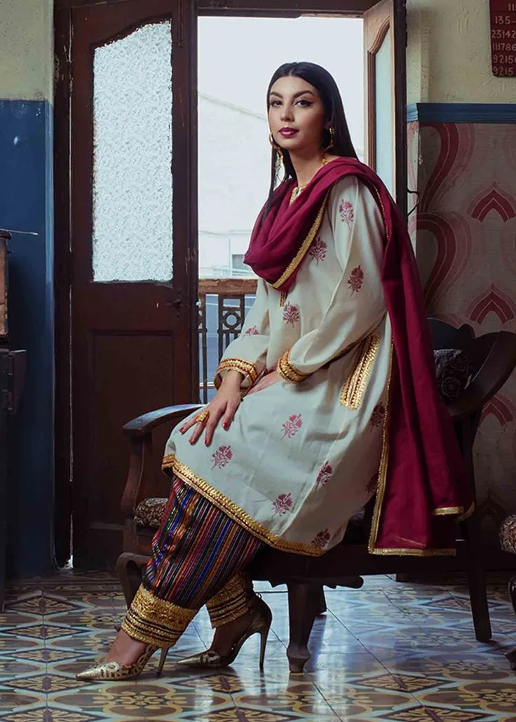 - Vibrant Striped Salwar: The standout feature—a multi-color striped salwar with intricate gold work at the cuffs—adds a playful yet elegant contrast, making a bold fashion statement.