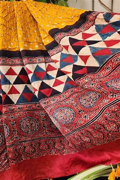 - Ajrakh Printing: Ancient block-print motifs inspired by nature & folklore from Ajrakhpur.